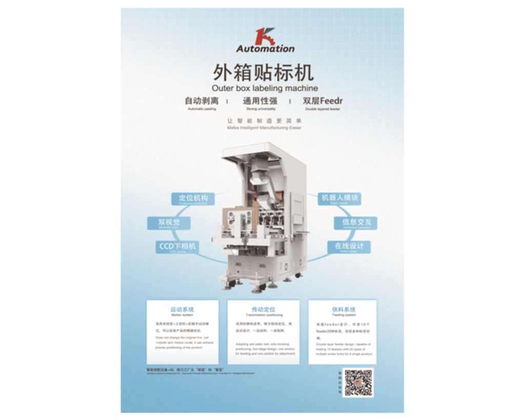 2. Máy dán nhãn thùng ngoài Máy dán nhãn thùng ngoài được thiết kế với tính tự động bóc tách, tính phổ dụng cao và bộ cấp liệu hai tầng. Thiết bị tích hợp robot, cơ cấu định vị, thị giác kép và camera CCD, giúp định vị và dán nhãn chính xác. Hệ thống truyền động sử dụng băng tải chống tĩnh điện, cơ chế chặn bên và thiết kế hai giai đoạn (cấp liệu – dán nhãn). Bộ cấp liệu hai tầng có thể chứa đến 10 feeder với 20 loại nhãn khác nhau, phù hợp cho nhiều sản phẩm, đảm bảo tốc độ và độ chính xác cao trong sản xuất thông minh.