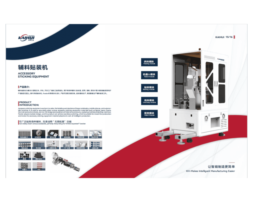1. Máy dán nhãn tự động Máy dán nhãn được phát triển để giải quyết các công đoạn dán nhãn trong sản xuất notebook, điện thoại di động và ô tô. Thiết bị có khả năng dán chính xác nhiều loại vật liệu (nhãn, băng keo, mút, tấm dẫn nhiệt, tấm dẫn điện, v.v.) theo yêu cầu thiết kế sản phẩm, thay thế phương pháp dán nhãn truyền thống. Máy hỗ trợ cấp liệu, dán nhãn và chuyển đổi linh hoạt, phù hợp với sản xuất đa dòng, nâng cao hiệu suất, đảm bảo độ ổn định và tính thông minh trong quy trình.